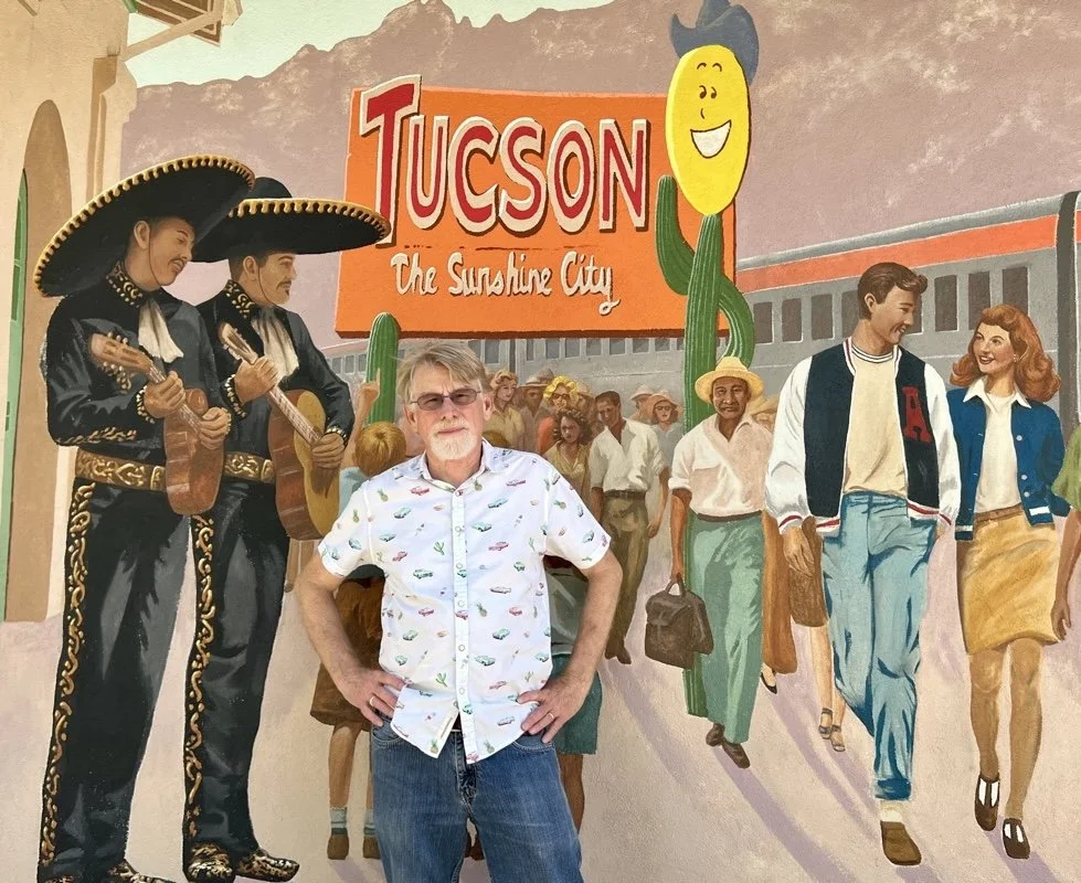 I create fine art in public places, murals that transform walls into lasting visual stories rooted in Tucson’s history, culture, and landscape. My work combines the depth of historical and scientific illustration with the atmosphere and craftsmanship of large-scale painting, allowing each mural to function as both public landmark and fine art experience. From the Presidio Museum and the Southern Arizona Transportation Museum to the Tucson Museum of Art, my murals are grounded in deep research and collaboration with historians, archaeologists, and community voices. My goal is to create work that gives people a stronger connection to place, history, and the shared stories that define Southern Arizona.