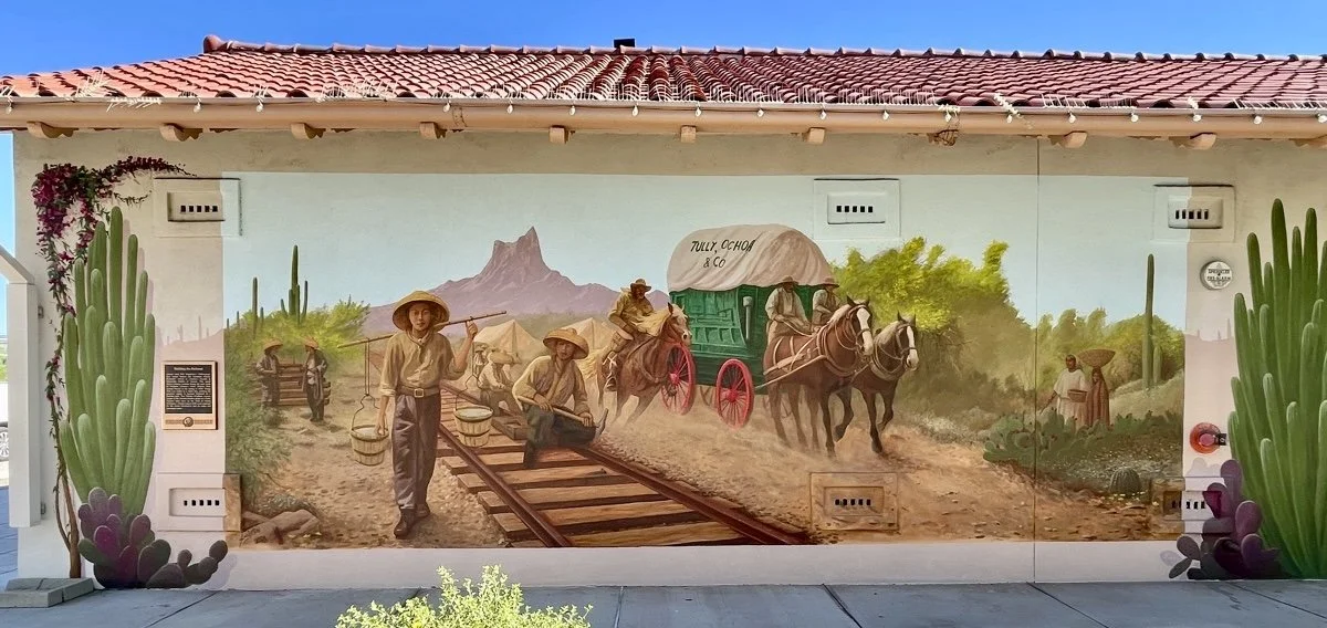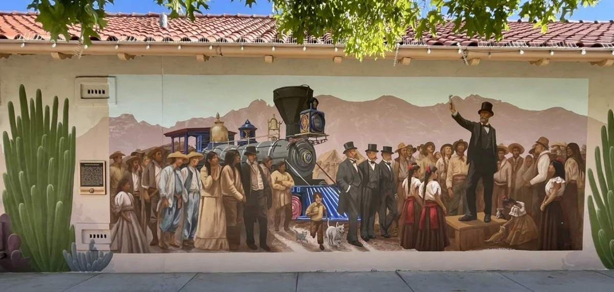 For the Southern Arizona Transportation Museum, I created a large-scale mural that captures the drama, diversity, and historical significance of Tucson’s railroad era. The piece begins with Chinese workers laying track through the desert, moves into the celebrated arrival of the first train in 1880, and continues into the golden age of rail tourism that helped define Tucson’s identity in the 20th century. Every section was built from careful historical research, from the train engine itself to the clothing, freight wagons, and multicultural crowd gathered to witness the moment. I approached the mural as a monumental history painting, designed not only to educate but to immerse viewers in the excitement of a turning point that changed Tucson forever.