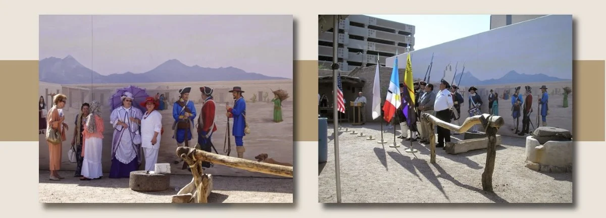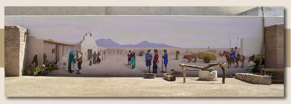 The Presidio San Agustín del Tucson Museum mural is a recreation of the northeast corner of the old Tucson Presidio which was built in the 1760s as protection from Apache raids. The walls were re-created using local adobe. A large block wall was constructed on the south side. This is the wall upon which I painted the mural. It was an intensive exercise in what I call "Visual Archaeology," requiring a deep immersion into the 18th-century soul of our city. Every detail—from the specific architecture of the adobe walls to the period-accurate uniforms of the soldiers—was informed by the site’s own 2006 archaeological excavation and rigorous historical consultation. My goal was to move beyond mere paint and build a durable, life-sized window through which the community can step directly into the year 1775.